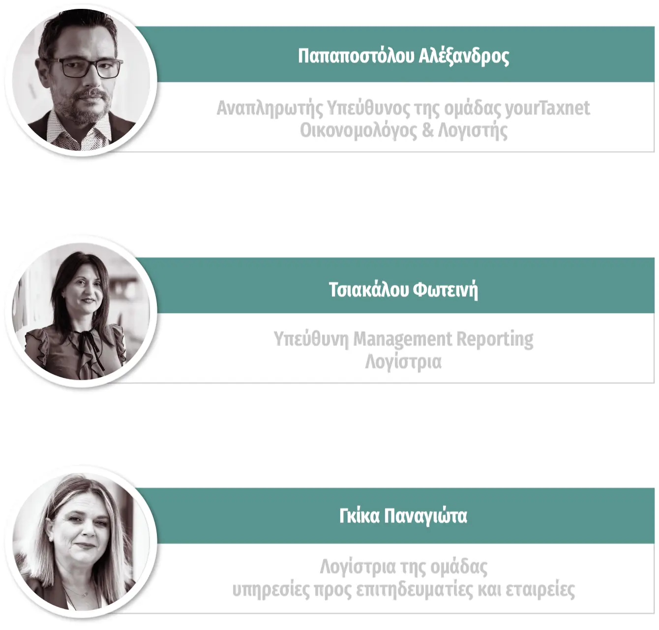 Στο yourTaxnet το πιο σημαντικό χαρτοφυλάκιο του είναι η ίδια η ομάδα του. Με βασικό γνώμονα, ειδικά σε μια εποχή που χαρακτηρίζεται από ολοένα και αυξανόμενες ανάγκες για εξειδικευμένες γνώσεις , την παροχή υπηρεσιών υψηλής ποιότητας με ανταγωνιστικό κόστος, η στελέχωση της ομάδας του γραφείου αποτελεί κορυφαία εσωτερική διαδικασία. Κύριο μέλημα του yourTaxnet είναι η έγκυρη και έγκαιρη υποστήριξη των πελατών από εξειδικευμένα στελέχη. Τα στελέχη της ομάδας του yourTaxnet εγγυόνται την αποτελεσματική διεκπαεραίωση των υποθέσεων των πελατών αξιοποιώντας την τεχνογνωσία τους, την πολυετή εμπειρία τους και την συνεχή επιμορφωτική κατάρτιση τους.
